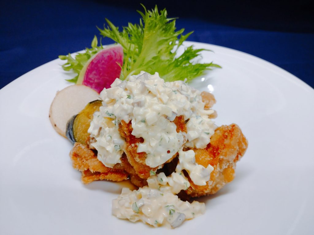 サクッと揚げた鶏肉に、甘酸っぱい南蛮だれといぶりがっこのタルタルソースをたっぷり絡めていただく一品です。