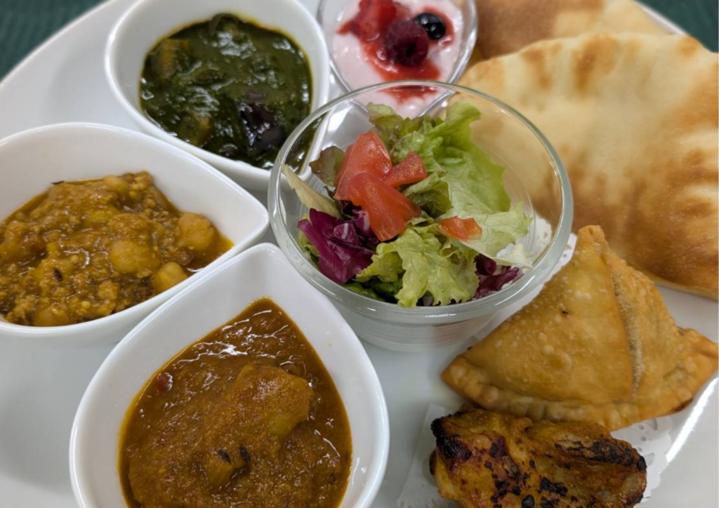 3種のカレーとサクッと揚げたサモサ、タンドリーチキンのスパイスで口いっぱいに広がるスパイスのハーモニーをお楽しみください🎶