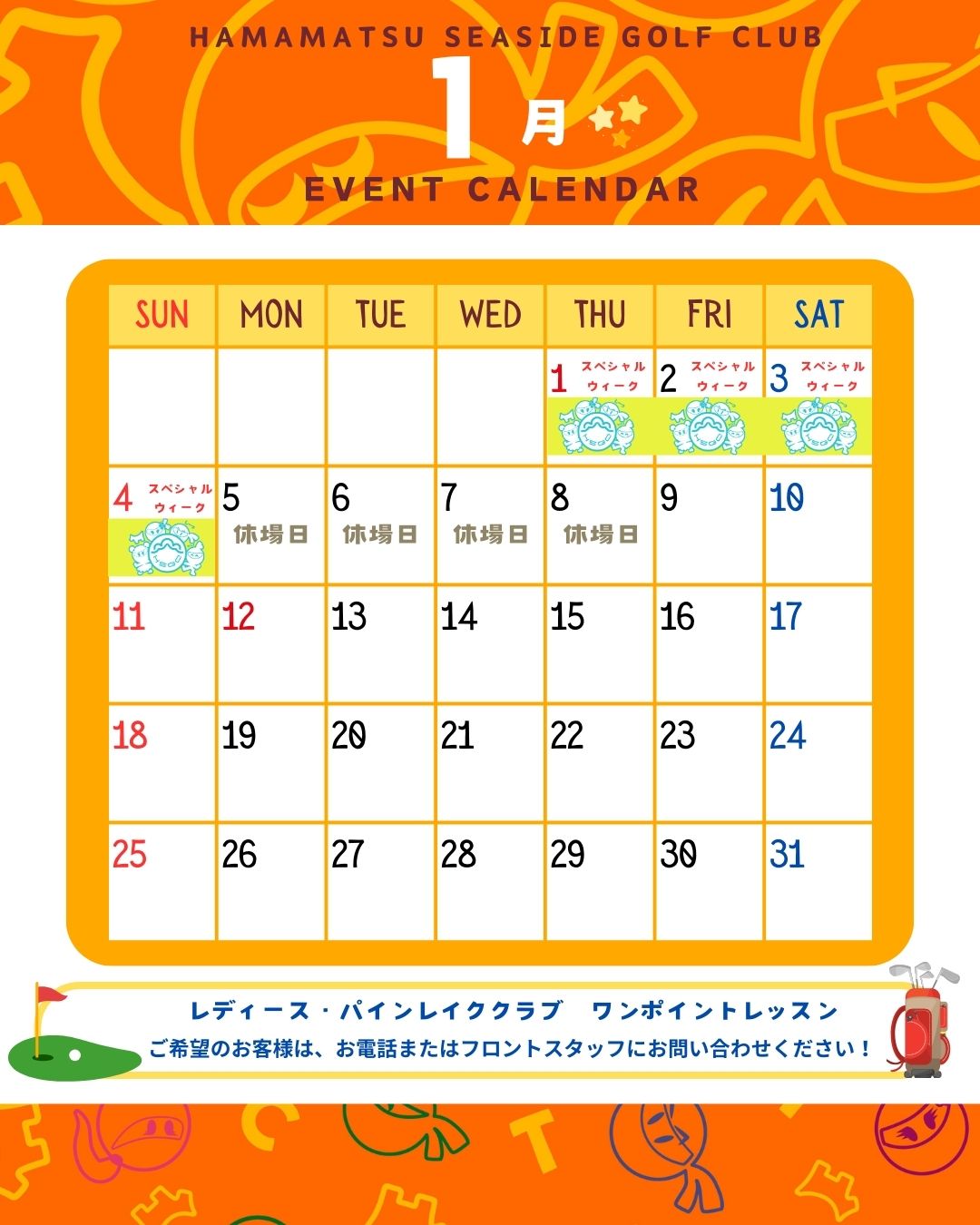 練習場利用のみも含む、浜松シーサイドゴルフクラブにプレーでご来場の女性のお客様とパインレイククラブの会員様を対象に、無料でワンポイントレッスンを行います。