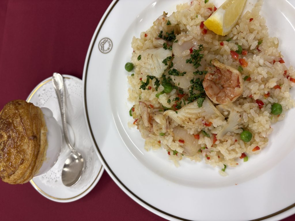 魚介の旨味が詰まったしっとりピラフと熱々のオニオンスープをサクサクのパイと共にどうぞ!