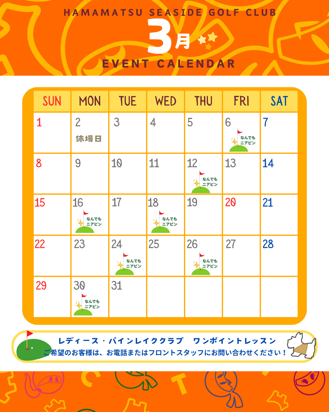 練習場利用のみも含む、浜松シーサイドゴルフクラブにプレーでご来場の女性のお客様とパインレイククラブの会員様を対象に、無料でワンポイントレッスンを行います。
