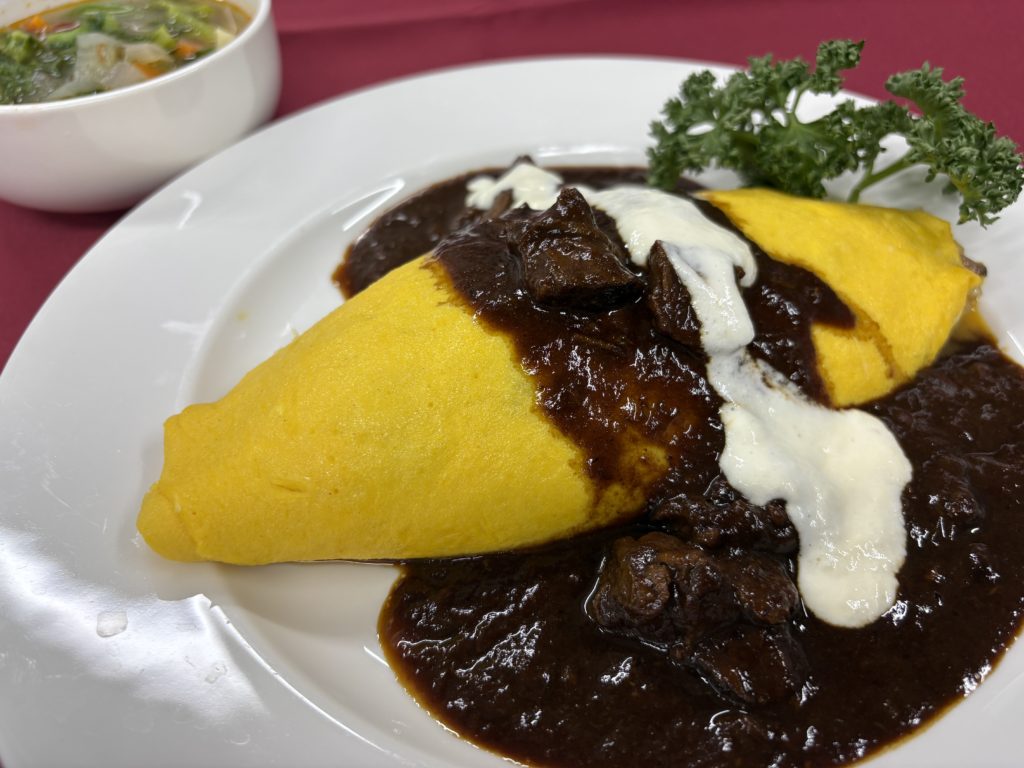 当レストラン自家製デミグラスソースを使ったビーフオムライスに爽やかなじゃばらサワークリームとのハーモニーをお楽しみ下さい。