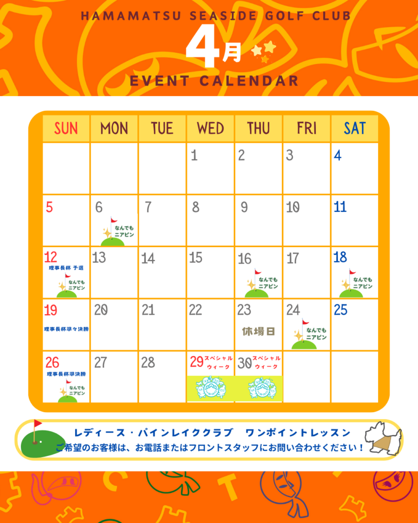 練習場利用のみも含む、浜松シーサイドゴルフクラブにプレーでご来場の女性のお客様とパインレイククラブの会員様を対象に、無料でワンポイントレッスンを行います。