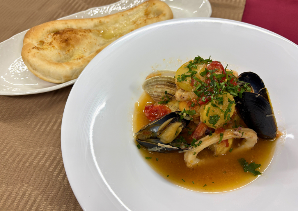 さっぱりとしたブイヤベースに、ガーリックの効いたナンを付けてお召し上がりください。