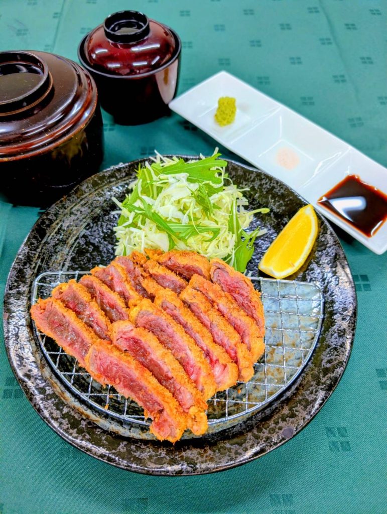 上質な牛肉を高温で短時間で揚げ、レアに仕上げております。お好みの薬味でおめし上がり下さい。
