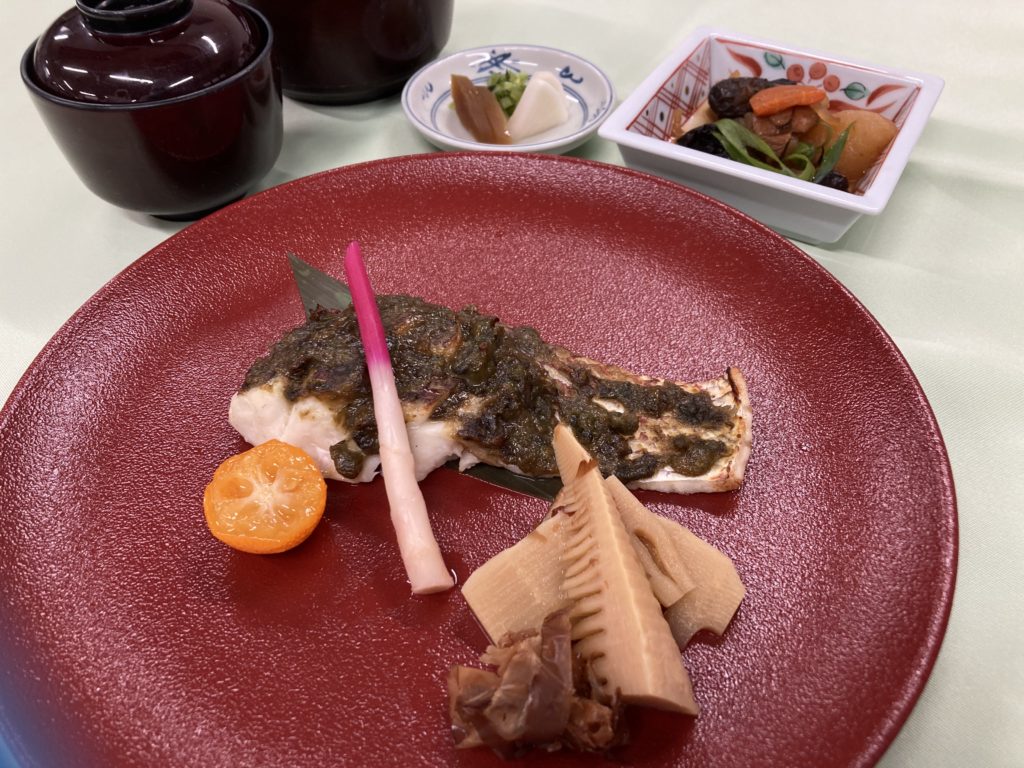 旬の真鯛をふき味噌焼きに仕上げました。ふきのとうのほろ苦さと味噌の甘さが癖になります。