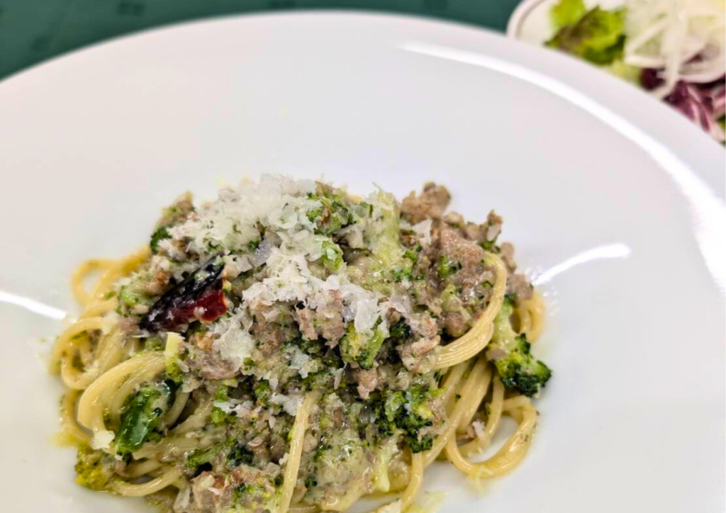 爽やかなハーブをまとわらせたサルシッチャをクリームソースに仕立てています。マッシュルームとブロッコリーがアクセントになっております。